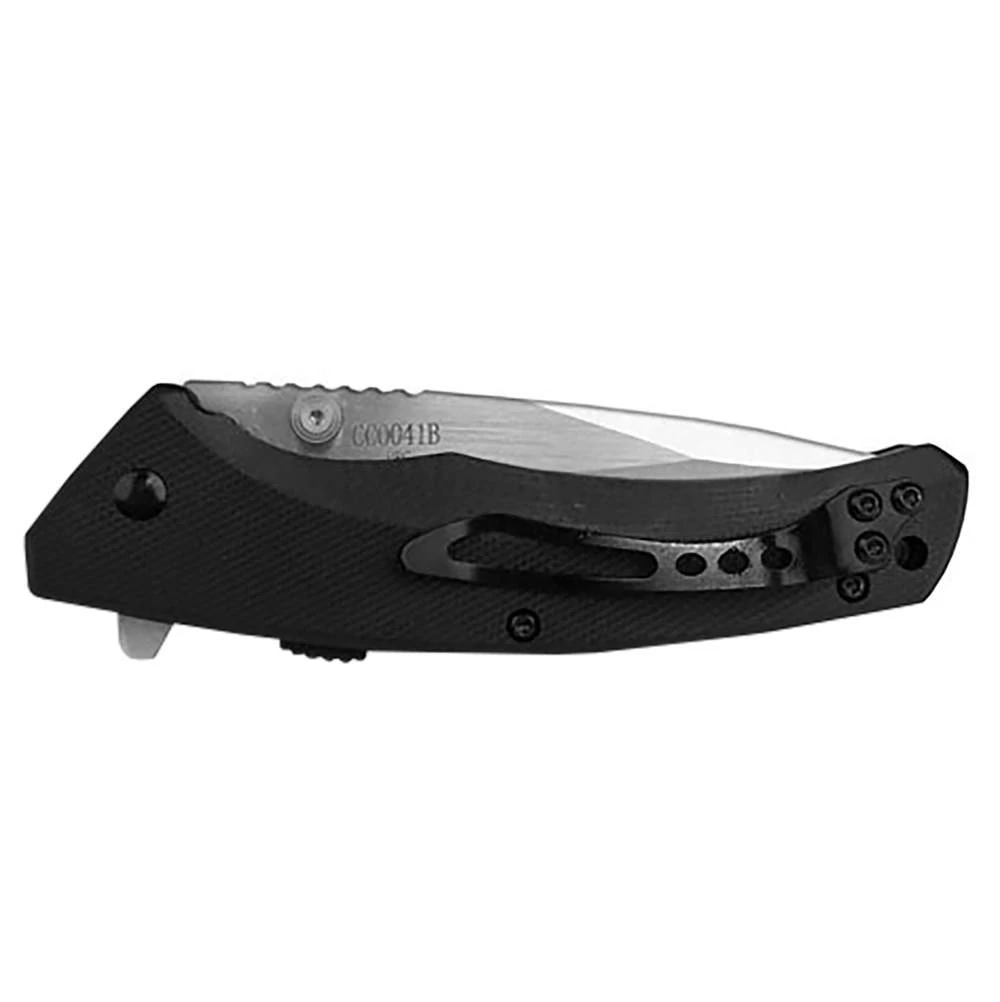 The Cattlemans Cutlery CC0041B Sidewinder Kinfe is a value priced assisted open EDC that featurs 3.5in drop point blade made of stainless steel with a two tone satin finish, a notched thumb rest for secrue grip, dual thumb studs, flipper and assist for ambidextrous one hand opening. The textured balck G10 handle, 4.25in closed, has a liner lock, a sliding safety, lanyard hole, and a stainless steel pocket clip mounted at the butt end. The Sidewinder has an overall open lenght of 7.75in. Made in China. CC0041B