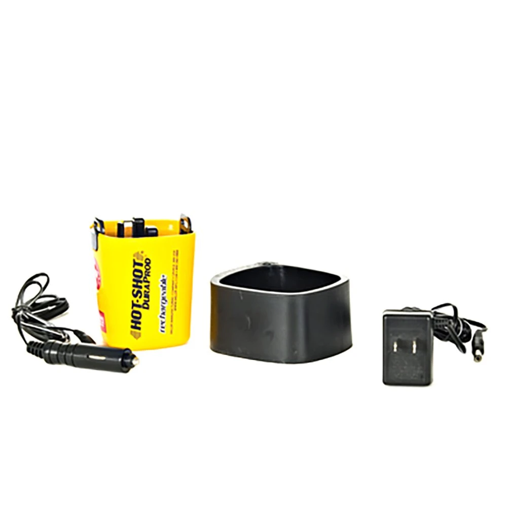 - Includes a Rechargeable Battery Pack for Hot-Shot DuraProd Rechargeable Electric Livestock Prod, 110V Adapter, 12V Adapter, and Charger Base