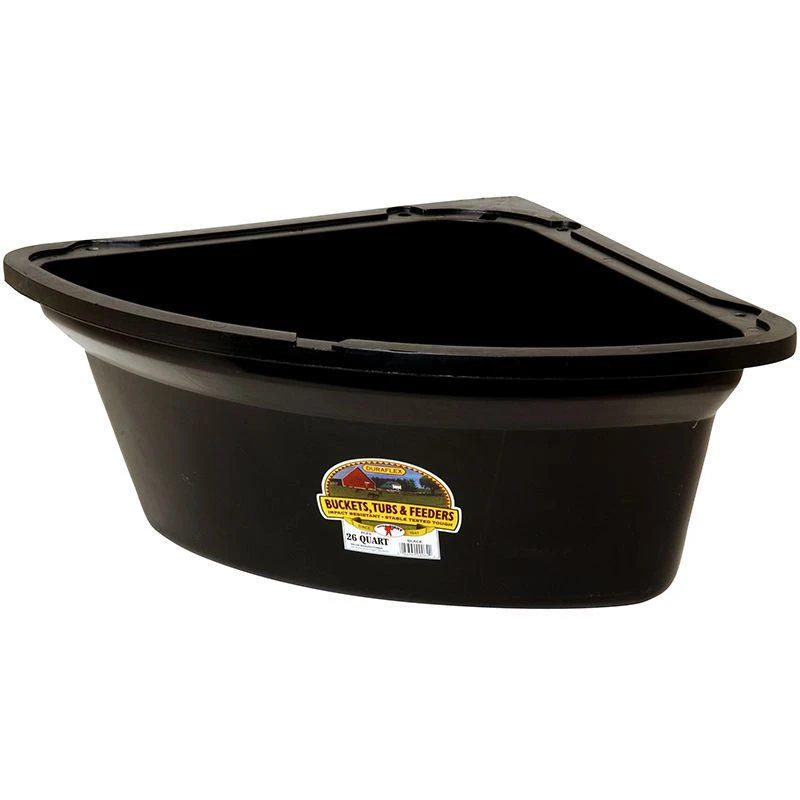 A corner feeder saves space and benefits from the added stability of the corner. High-impact polyethylene plastic stands up to tough farm use. Great for horses, sheep, goats, alpacas, and cattle. The Little Giant Corner Feeder can be mounted permanently on the top of two perpendicular rails with four lag screws (not included). Available in several colors. Measures 25.5 inch long by 19.5 inch wide by 9.75 inch high. Holds 26 quarts (6.5 gallons).