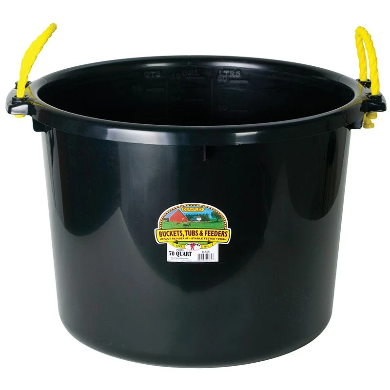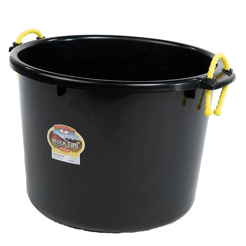 The perfect solution to a never-ending problem! The Little Giant 70-Quart Muck Tub can help you handle big or small cleanup jobs with ease. The ample mouth size lets you load it up fast, and the poly rope handles are strong and comfortable. Made from high-density polyethylene to protect against warpage and help prevent stress cracks. 21.75 inch diameter (exclusive of handles) by 17.25 inch high, holds 70 quarts (17.5 gallons).