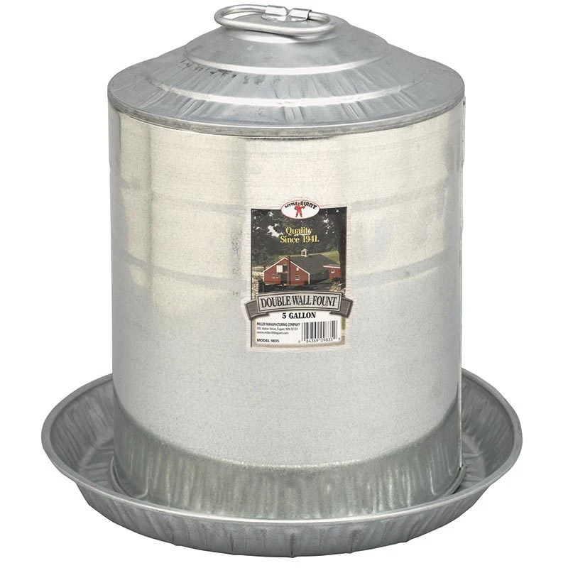 A heavy-duty standalone waterer for chickens, turkeys, and other poultry. Double-wall construction features an inner tube with a strong arched handle for carrying the filled fount and an outer tube with its own handle for convenience. When the outer tube is inserted over the inner tube, a copper spring and neoprene seal create a vacuum to maintain a constant water level in the drinking pan. Features a locking pin to hold the outer tube in place. Sloped top prevents roosting. Constructed of heavy-gauge galvanized steel with rolled edges for safety. Seams are constructed and tested to prevent leaks. This is not a hanging water; must be placed on the ground or floor. 15.25 inch diameter by 15.25 inch high, holds 5 gallons.