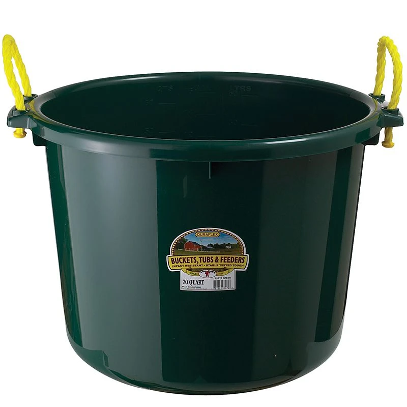 The perfect solution to a never-ending problem! The Little Giant 70-Quart Muck Tub can help you handle big or small cleanup jobs with ease. The ample mouth size lets you load it up fast, and the poly rope handles are strong and comfortable. Made from high-density polyethylene to protect against warpage and help prevent stress cracks. 21.75 inch diameter (exclusive of handles) by 17.25 inch high, holds 70 quarts (17.5 gallons).