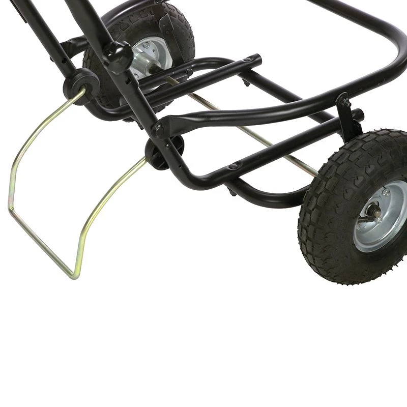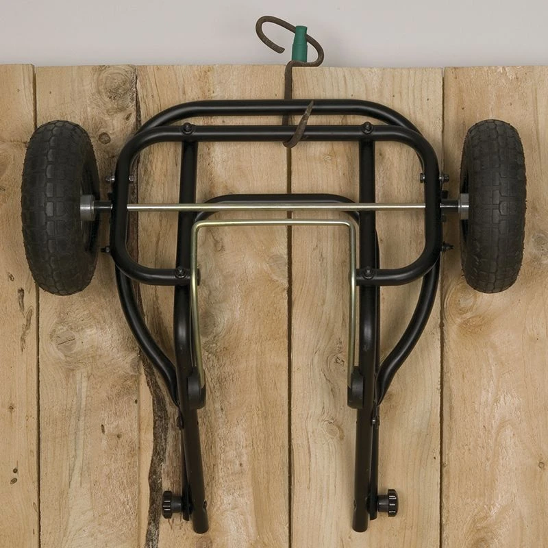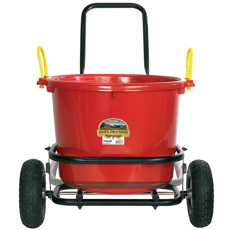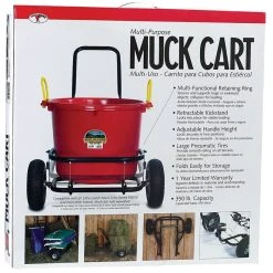 You can’t even think of all the uses you’ll find for this little workhorse! It’s designed to hold a standard 70-Quart Muck Tub (not included), but handily doubles as a pneumatic two-wheeler for moving feed sacks, square bales, garbage cans, or any you-name-it cargo up to 350 pounds. The drop-down retaining ring securely holds a Muck Tub or other containers in place, and easily collapses for loading full, heavy, or large items. Large pneumatic tires allow the cart to maneuver over almost any terrain, indoors or outdoors. The retractable kickstand holds the cart in place for stable loading and unloading. Adjustable handle locks securely at two heights. It easily folds for storage or for carrying along in a trailer or vehicle. A lifesaver for farm and ranch.