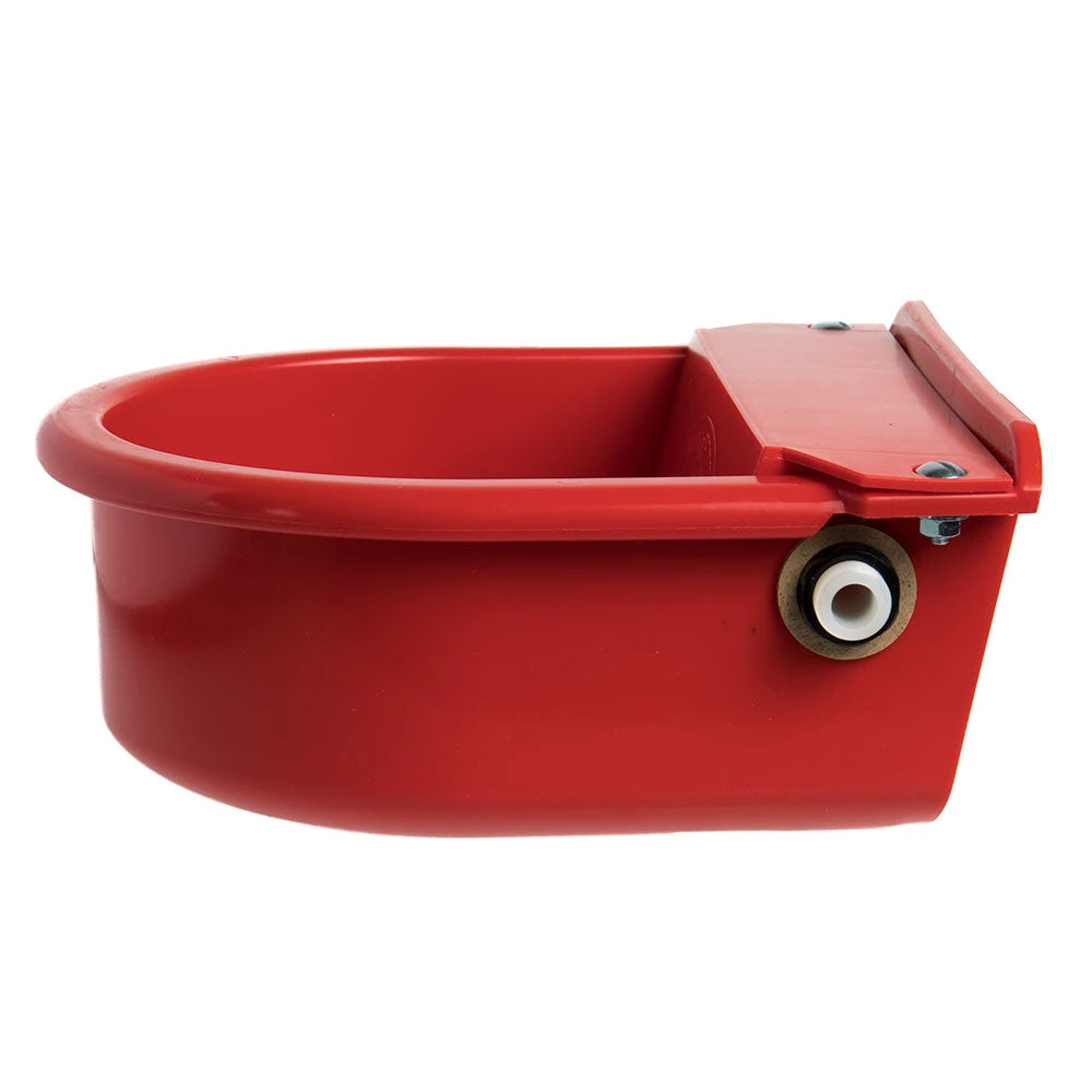 This dependable, all-purpose automatic waterer is easy to connect to pipe, flex hose, or garden hose water supply. Works well for horses, cattle, hogs, goats, and other outside animals, with no special training required. Not intended for use inside a home. Safely operates between 20 and 50 pounds per square inch pressure. Constructed from durable UV-resistant plastic and will not rust or corrode. the adjustable float control allows it to maintain a constant water level. Can be easily installed at any height using lag bolts or through bolts. Mounting plates are included but other mounting and water connection hardware are not included. Recommended mounting hardware to fence: two 3/8 inch diameter bolts or two 3/8 inch lag screws. Mounting to a wall: two 3/8 inch lag screws. Will fit a 1/2 inch pipe or hose with a left or right connection. Measures 10 inch long by 10.75 inch wide by 5.5 inch high.