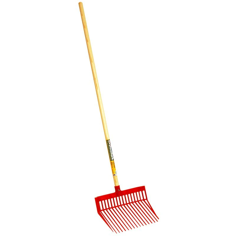 This is the original Little Giant DuraFork bedding fork that is a fixture in stables and barns everywhere. Manufactured from extra-strong 100 percent polycarbonate to provide super strength and flexibility. Designed for long-lasting use around the farm, ranch, and home. Specially designed tines are uniquely angled to provide easy manure pickup with less spilling. Nylon locknut secures the 52 inch long by 1.125 inch diameter hardwood handle. Fork head is 13.125 inch long by 15.125 inch wide. Red fork head.