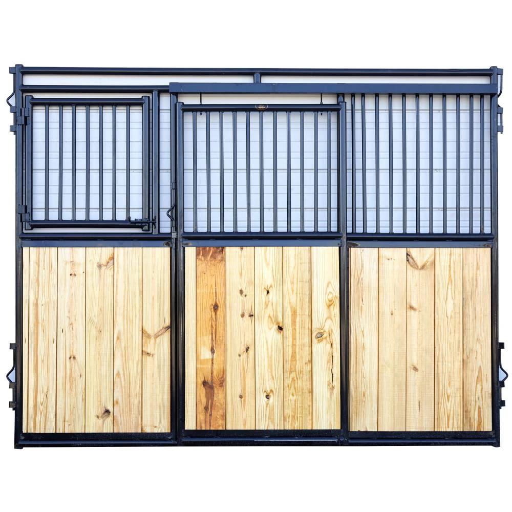 Metro Gate Stalls are safe, attractive, and affordable. This Stall Front combines a vertical bar top with a wood-filled bottom (Wood Kit sold separately). These stalls are designed with the highest degree of consideration for the safety of both the horse and handler. Our Stalls offer horse owners practical solutions for creating a safe, functional enviroment for their valued animals. This stall front features a center-open door design.  Each stall door includes an access window. The stall features an attractive black powder coat finish to help the stall resist rust, scratches, and fading, adding years of life to your investment. No tools are required for assembly. Our stall fronts and panels join using simple pin connectors. A starter post is required for stall setup when you are not connecting to a wall or other existing structure.Â